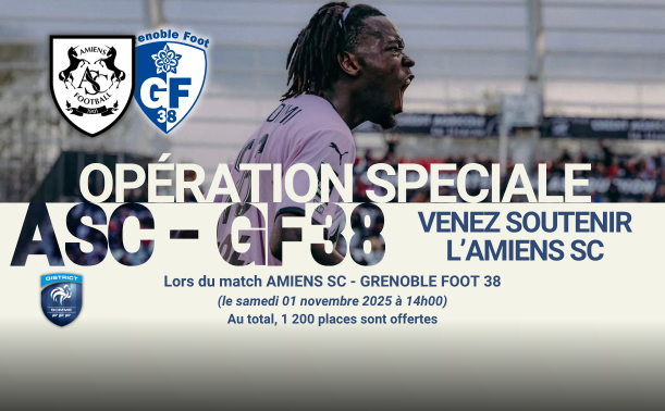 L’Amiens SC vous offre une nouvelle fois la possibilité de venir encourager en nombre notre équipe phare lors de la rencontre du 01/11/2025 contre le Grenoble Foot 38 à 14h00 au Stade Crédit Agricole La Licorne.